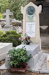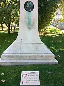 Sa dépouille est inhumée au cimetière de Montmartre à Paris en présence de trois amis malgré son vœu testamentaire d'être enterré à Andilly, où il avait séjourné[93]. Comme ultime provocation, il avait dès 1821 composé lui-même son épitaphe en italien Arrigo Beyle Milanese Scrisse Amò Visse (« Henri Beyle. Milanais. Il écrivit, Il aima, Il vécut[94] ») que fait graver Romain Colomb, son cousin et ami d'enfance, exécuteur testamentaire[95]. Méprisé et raillé par son siècle, il ne connaîtra qu'un succès posthume comme il l'avait prédit : « Je serai connu en 1880. Je serai compris en 1930 »[96]. Le médaillon de sa tombe a été réalisé par Auguste Rodin[97].