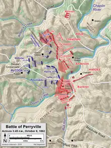 L’infanterie de l'Union et une batterie d'artillerie postés sur une colline, près de la route de Benton tirent sur les hommes de Wood et les forcent à retourner en arrière. Wood réforme de sa brigade à la base au bas de la colline et renouvelle l'assaut. Les canons fédéraux sont à court de munitions et se retirent, et l'attaque confédérée repousse l'infanterie de l'Union vers le carrefour. Après la charge, les hommes de Wood se retirent et sont remplacés par la brigade de réserve du brigadier général St. John Richardson Liddell. Dans ce combat, Wood est blessé à la tête et est hors de combat jusqu'en novembre, où l'armée du Mississippi s'appelle désormais l'armée du Tennessee.