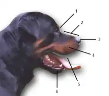 1 : stop – 2 : chanfrein – 3 : truffe – 4 : babine – 5 : bouche – 6 : mandibule.