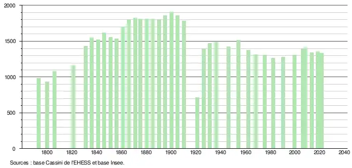 L'évolution du nombre d'habitants est connue à travers les recensements de la population effectués dans la commune depuis 1793. Pour les communes de moins de 10 000 habitants, une enquête de recensement portant sur toute la population est réalisée tous les cinq ans, les populations légales des années intermédiaires étant quant à elles estimées par interpolation ou extrapolation[23]. Pour la commune, le premier recensement exhaustif entrant dans le cadre du nouveau dispositif a été réalisé en 2008[24].