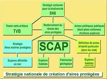 En 2004, la France a publié sa première stratégie nationale pour la biodiversité (SNB) en tant que telle, définie avec des plans sectoriels devant s'achever en 2008, suivis d'une seconde programmation 2009-2010 de plans d'action. En 2011, cette stratégie a été révisée[1], en reconnaissant le constat d'échec de la précédente (comme ailleurs dans le monde) et en visant notamment à intégrer certains apports du Grenelle de l'Environnement et de la loi Grenelle I qui prévoit que « la SNDD et la SNB sont élaborées par l'État en cohérence avec la stratégie européenne de développement durable et en concertation avec les représentants des élus nationaux et locaux, des employeurs, des salariés et de la société civile […] »[2]. Des appels à projets thématiques ont été lancés sur les thèmes suivants : « A- Rétablissement des continuités écologiques des infrastructures de transport existantes, B- Restauration de milieux remarquables ou sensibles, C- Lutte contre les espèces exotiques envahissantes terrestres et marines dans les départements et collectivités d'outre-mer, D- Conservation et utilisation durable d’espèces végétales indigènes pour développer des filières locales, E- Projets innovants dans le domaine de l’ingénierie écologique, F- Infrastructures agroécologiques, G- Trames vertes et bleues urbaines » (les deux derniers étant ouverts jusqu'au ).