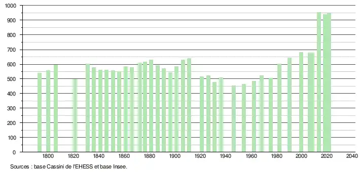L'évolution du nombre d'habitants est connue à travers les recensements de la population effectués dans la commune depuis 1793. Pour les communes de moins de 10 000 habitants, une enquête de recensement portant sur toute la population est réalisée tous les cinq ans, les populations légales des années intermédiaires étant quant à elles estimées par interpolation ou extrapolation[27]. Pour la commune, le premier recensement exhaustif entrant dans le cadre du nouveau dispositif a été réalisé en 2008[28].
