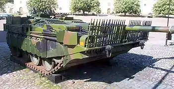 Les Suédois tirèrent pleinement profit de la solution à canon fixe pour implanter à la pointe du glacis un treillis de trente-deux barres métalliques de 30 mm de diamètre chacune. Ce treillis, monté uniquement en temps de guerre, est destiné à faire détoner prématurément les roquettes et missiles antichar ainsi que les obus à charge creuse dans le but d'affaiblir leur capacité de pénétration. Son efficacité fut prouvée lors de tests effectués avec le missile antichar Rb 53 BANTAM.