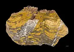 Un stromatolithe[Note 1], ou stromatolite (on parle aussi parfois de « thrombolite »), est une structure laminaire constituée de calcaire, parfois de silice, qui se développe en milieu aquatique peu profond, marin ou d'eau douce continentale[Note 2],[1],[2],[3]. Les stromatolithes sont d'origine à la fois biogénique (biolithogenèse par des communautés de cyanobactéries) et sédimentaire (structures carbonatées en feuillets empilés formés de particules sédimentaires piégées dans des voiles algaires gélatineux produits par ces bactéries).