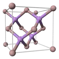 - soit comme la maille d'un cristal CFC dont quatre des huit sites tétraédriques sont occupés, deux dans la moitié basse du cube, suivant une petite diagonale, et deux dans la moitié haute, suivant l'autre petite diagonale. Un site tétraédrique d'une maille CFC est le centre du tétraèdre formé par un atome au coin du cube, et les trois atomes au centre de chacune des faces se rejoignant dans ce même coin.