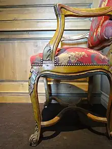 - Les sièges : les dossiers sont moins imposants que sous Louis XIV et sont cintrés, les montants latéraux sont mouvementés, les consoles d'accotoirs sont en retrait des pieds avant. L'ajout de manchettes garnies sur les accotoirs se généralise. Les pieds sont cambrés et ne sont plus reliés par une entretoise. La tapisserie prend moins d'importance, les traverses du dossier et de l'assise sont apparents et sculptés (motifs de style rocaille : coquilles et feuilles d'eau).