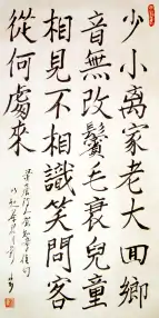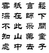 Voici les cinq premiers caractères de la première colonne (en partant de la droite) de l'illustration ci-contre, une œuvre du calligraphe, poète et graveur de sceaux 山杉 Shānshān, en caractères actuels, à titre de comparaison : 松下問童子 sōng xià wèn tóng zǐ, extrait d'un poème de 賈島 Jia Dao (en), poète 唐 Táng :「尋隱者不遇」 Xún yǐn zhě bú yù (« À la recherche d’un ermite, sans le rencontrer »).