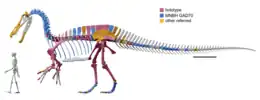 Reconstitution numérique du squelette de Suchomimus montrant les os connus basés sur l'holotype (en rouge), un squelette partiel (en bleu) et d'autres spécimens référencés (en jaune).