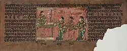 La reine Sudeshna saluée par Draupadi et d'autres dames de compagnie.
