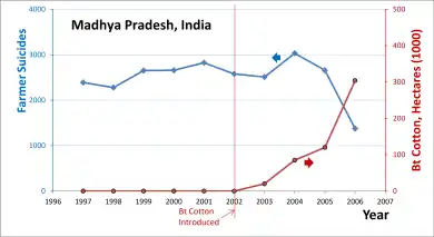 Un certain nombre de groupes d'activistes sociaux et d'études ont proposé un lien entre les cultures génétiquement modifiées coûteuses et les suicides d'agriculteurs[47],[38]: notamment, le coton Bt (Bacillus thuringiensis) aurait été à l'origine des suicides d'agriculteurs[48]. Les graines de coton Bt coûtent presque le double de celles ordinaires. Les coûts plus élevés ont obligé de nombreux agriculteurs à contracter des emprunts toujours plus importants, souvent auprès de prêteurs privés appliquant des taux d’intérêt exorbitants (60% par an). Les prêteurs obligent les agriculteurs à leur vendre leur coton à un prix inférieur à celui du marché. Selon les activistes, cela a créé une source d'endettement et de stress économique, voire de suicide, chez les agriculteurs. L'augmentation des coûts dans l'agriculture associée à la diminution des rendements, même avec l'utilisation de semences de coton Bt, est souvent citée comme une cause de détresse parmi les agriculteurs du centre de l'Inde[49]. Des spécialistes affirment que cette théorie du coton Bt repose sur certaines hypothèses qui ignorent la réalité du terrain[50].