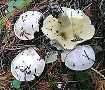 La forme blanche du Bolet jaune (Suillus luteus) peut prêter à confusion, mais elle porte un anneau sur le pied. Le Bolet de Bellini (Suillus bellinii) est aussi tout blanc au départ, mais il pousse sous les pins à deux aiguilles[5].