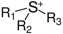 Les composés sulfonium ont une géométrie pyramidale au niveau de l'atome de soufre. Ainsi, le cation triméthylsulfonium (Me3S+) est structurellement similaire au composé isoélectronique triméthylphosphine. Les composés sulfonium où les trois substiaunt sont différents sont chiraux et optiquement stables[2].
