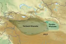 Lorsque le Chagatai ulus, qui englobait à la fois le Turkestan oriental et occidental, s'est effondré, le résultat a été la création de deux États différents : Maverannahr au Turkestan occidental, avec sa capitale à Samarkand, où Timur le Grand est arrivé au pouvoir en 1370, et le Moghulistan, avec sa capitale à Almalik, près de l'actuelle ville de Gulja, dans la vallée d'Ili. Le Moghulistan comprenait des terres sédentaires du Turkestan oriental ainsi que des terres nomades au nord de Tangri Tagh . Les terres habitées étaient connues à l'époque sous le nom de Manglai Sobe ou Mangalai Suyah, qui se traduit par Shiny Land, ou Terre avancée qui faisait face au soleil. Ces terres comprenaient des villes-oasis de l'ouest et du centre du Tarim, telles que Khotan, Yarkand, Yangihisar, Kashgar, Aksu et Uch Turpan ; et impliquait à peine les villes-oasis de l'est de Tangri Tagh, telles que Kucha, Karashahr, Turpan et Kumul, où existaient encore une administration ouïghoure locale et une population bouddhiste. Les zones nomades comprenaient l'actuel Kirghizistan et une partie du Kazakhstan, y compris Jettisu, la région des sept rivières.