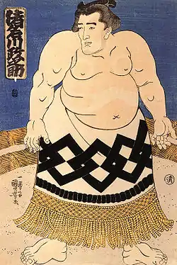 L'unification du Japon sous le shogunat Tokugawa, en 1603, est suivi d'une période de paix et de prospérité (époque d'Edo), marquée par le développement d'une classe aisée de commerçants[2]. Des groupes de sumo professionnels sont créés pour divertir la classe bourgeoise et le combat sumo prend sa forme quasi actuelle, en tant que sport national du Japon à partir du XVIIIe siècle[2],[3]. C'est notamment à cette époque que le dohyō est surélevé et que la position avec les deux poings sur le ring lors du tachi-ai (début du combat) est adoptée, bien que non obligatoire[4]. Cependant, les tournois n'ont alors pas de champion et n'offrent pas de prix aux lutteurs les plus performants. Le score d'un lutteur lors d'un tournoi n'est pas important et la promotion dans la hiérarchie est plus liée à sa popularité[5].