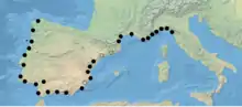 Carte de 33 populations européennes de fourmi argentine échantillonnées. Les populations ont été assignées à l'un des deux groupes distincts sur la base des tests d'agressivité : la supercolonie principale (●) et la supercolonie catalane (○). Dans la population marquée d'un astérisque "*", les ouvrières étaient fortement infectées par des acariens, ce qui affectait les interactions comportementales. Par conséquent, cette population n’a pas été incluse dans l’analyse des données comportementales[4].