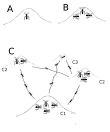 Illustration schématique des 3 types principaux de structure sociale chez les fourmis. Légende : A Monogyne-Monodôme, B Polygyne-Monodôme, C Polygyne-Polydôme, C1 Fourmilière principale, C2 Fourmilière secondaire, C3 Fourmilière saisonnière