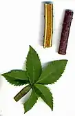 | Sureau rouge | Arbuste à feuilles caduques composées ne dépassant pas 4 m[11] (moelle orangé à brun) | en avril-mai | Étamines jaunes | Cyme multipare | ![]() |