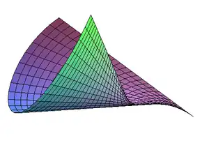 - le conoïde, dont les génératrices sont parallèles à un plan donné (plan directeur) et passent par une droite (axe du conoïde).