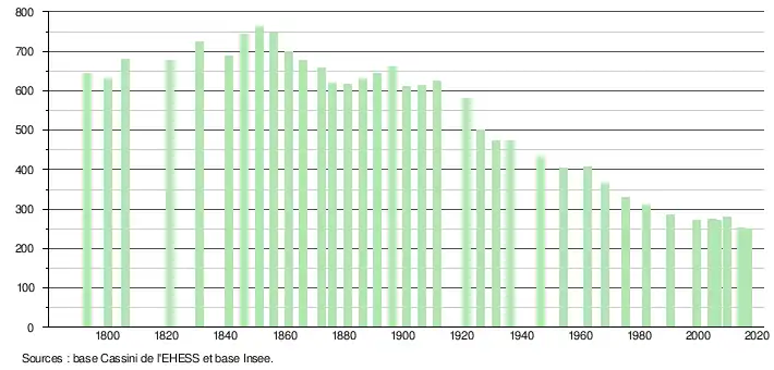 L'évolution du nombre d'habitants est connue à travers les recensements de la population effectués dans la commune depuis 1793. Pour les communes de moins de 10 000 habitants, une enquête de recensement portant sur toute la population est réalisée tous les cinq ans, les populations légales des années intermédiaires étant quant à elles estimées par interpolation ou extrapolation[18]. Pour la commune, le premier recensement exhaustif entrant dans le cadre du nouveau dispositif a été réalisé en 2004[19].