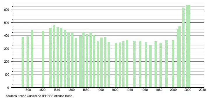 L'évolution du nombre d'habitants est connue à travers les recensements de la population effectués dans la commune depuis 1793. Pour les communes de moins de 10 000 habitants, une enquête de recensement portant sur toute la population est réalisée tous les cinq ans, les populations légales des années intermédiaires étant quant à elles estimées par interpolation ou extrapolation[39]. Pour la commune, le premier recensement exhaustif entrant dans le cadre du nouveau dispositif a été réalisé en 2008[40].
