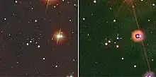 Image de la zone du ciel où est située la rémanence en lumière visible du sursaut gamma GRB 970228 prise par le télescope spatial Hubble. Sa position se superpose pratiquement avec celle d'une galaxie mais les tenants de l'origine galactique ne seront définitivement convaincus qu'avec la découverte de GRB 970508.