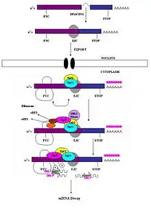 Si le codon stop est bien situé sur le dernier exon, il ne reste normalement pas d'EJC sur l'ARNm lorsque le ribosome l'atteint. Dans le cas contraire, les facteurs de traduction eRF1 et eRF3 interagissent avec les EJC encore présents sur l'ARNm ce qui trahit la présence d'un codon stop prématuré[14]. Cette interaction conduit au marquage de l'ARNm par des facteurs favorisant sa dégradation par les nucléases de la cellule[11],[14].