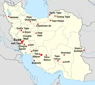 La Susiane d'avant Suse connaît déjà quelques agglomérations fondées au Néolithique : le plus ancien village fouillé dans la région est Chogha Bonut, habité vers la fin du VIIIe millénaire av. J.-C.[28], puis d'autres sites plus importants émergent vers la fin du VIe ou au début du Ve millénaire av. J.-C. (chalcolithique) : chronologiquement Djafarrabad, Djowi et Bendebal, puis Chogha Mish[29]. Suse naît donc dans une région déjà avancée dans le processus des débuts de l'urbanisation, et ce site illustre un nouveau stade dans l'affirmation du fait urbain, et la marche vers l'apparition de l’État. Elle balance entre les influences de la Basse Mésopotamie voisine, qui est alors une région motrice dans le développement des institutions étatiques, de l'urbanisation, de l'écriture, et celles des cultures du plateau Iranien qui connaissent des évolutions similaires. La culture matérielle susienne présente de ce fait un profil diversifié, reflétant les contacts de ses habitants avec les régions voisinant la Susiane et même parfois d'autres, plus lointaines.