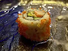 Le ura-maki zushi est un modèle californien avec une couche de riz par-dessus la feuille de nori.