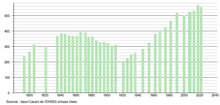 L'évolution du nombre d'habitants est connue à travers les recensements de la population effectués dans la commune depuis 1793. Pour les communes de moins de 10 000 habitants, une enquête de recensement portant sur toute la population est réalisée tous les cinq ans, les populations légales des années intermédiaires étant quant à elles estimées par interpolation ou extrapolation[17]. Pour la commune, le premier recensement exhaustif entrant dans le cadre du nouveau dispositif a été réalisé en 2007[18].