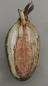 Le fruit dur et marron, en forme de poire, mesure de 14 à 16 cm et son diamètre est de 6 cm. A maturité il s'ouvre par la base en 5 valves charnues qui contiennent de nombreuses graines plates pourvues d'une membrane.
