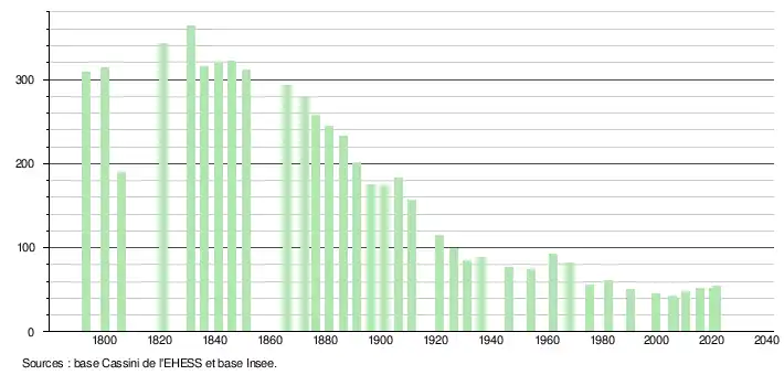 L'évolution du nombre d'habitants est connue à travers les recensements de la population effectués dans la commune depuis 1793. Pour les communes de moins de 10 000 habitants, une enquête de recensement portant sur toute la population est réalisée tous les cinq ans, les populations légales des années intermédiaires étant quant à elles estimées par interpolation ou extrapolation[20]. Pour la commune, le premier recensement exhaustif entrant dans le cadre du nouveau dispositif a été réalisé en 2005[21].