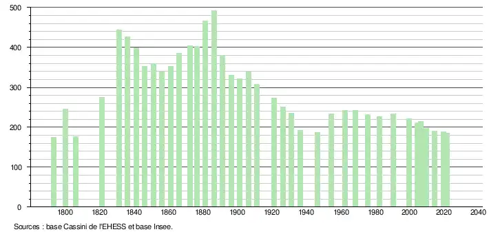 L'évolution du nombre d'habitants est connue à travers les recensements de la population effectués dans la commune depuis 1793. Pour les communes de moins de 10 000 habitants, une enquête de recensement portant sur toute la population est réalisée tous les cinq ans, les populations légales des années intermédiaires étant quant à elles estimées par interpolation ou extrapolation[16]. Pour la commune, le premier recensement exhaustif entrant dans le cadre du nouveau dispositif a été réalisé en 2004[17].