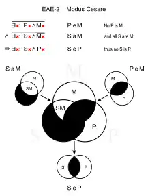 - permutation des deux premières prémisses, ce qui donne nul M n'est S, or tout P est M. L'application de Celarent sur ces deux prémisses permet d'en déduire nul P n'est S.