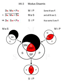 Ces propositions doivent être construites dans un ordre précis : le sujet de la conclusion, en effet, doit être présent dans une des prémisses (normalement la mineure), son prédicat dans l'autre (la plupart du temps la majeure), pour que le syllogisme soit valide. Le moyen terme (M) établit le rapport : {M est P} or {S est M} donc {S est P} [alpha 1].