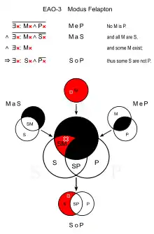 - Dans la logique médiévale, l'ensemble vide n'existe pas. Il en résulte que, si tout S est P, a fortiori, quelque S est P. Si cette hypothèse n'est pas respectée, alors les syllogismes Bamalip, Darapti, Felapton et Fesapo cessent d'être valides. Cette convention est encore présente en 1886 dans le livre Logique sans peine, de Lewis Carroll, mais sera rejetée par Frege.