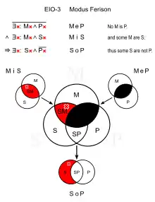Ferison est le syllogisme nul M n'est P, or quelque M est S, donc quelque S est non-P. On le prouve en transformant simplement la deuxième prémisse en quelque S est M. L'application de Ferio (nul M n'est P, or quelque S est M, donc quelque S est-non P) conduit à la conclusion voulue.