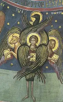 - Le tétramorphe, ou les « quatre vivants », ou encore les « quatre êtres vivants », représente les quatre animaux ailés tirant le char de la vision d'Ezéchiel (I, 1-14). On les retrouve dans l'Apocalypse de Jean (IV, 7-8). Plus tard, les Pères de l'Église en ont fait l'emblème aux quatre Évangélistes: le lion pour Marc, le taureau pour Luc, l'homme pour Matthieu et l'aigle pour Jean. Ils accompagnent souvent les représentations du Christ en majesté.