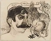 Le principal manifeste du symbolisme en peinture date de 1891 : le critique Gabriel-Albert Aurier publie, dans le Mercure de France, un article qu'il intitule « Le symbolisme en peinture : Paul Gauguin »[52]. Entre 1889 et 1891, Gauguin fréquente assidûment les milieux symbolistes parisiens, où il se fait connaître comme « le » peintre symboliste auprès des critiques[53]. Aurier souligne dans son article la rupture de Gauguin, et des jeunes artistes modernes en général, avec l'impressionnisme qui ne vise selon lui que « l'imitation de la matière »[3],[54] : « Donc, qu'on invente un nouveau vocable en iste […] pour les nouveaux venus à la tête desquels marche Gauguin : synthétistes, idéistes, symbolistes, comme il plaira[3]. » Le manifeste d'Aurier présente Gauguin comme le seul créateur du symbolisme pictural, en prenant l'exemple de son tableau La lutte de Jacob avec l'ange, peint en 1888 et décrit en détail au début de son article. Or Gauguin aurait pris pour modèle les Bretonnes dans la prairie d'Émile Bernard, un jeune peintre présent à Pont-Aven et ayant lui aussi participé à l'exposition Volpini, qui l'aurait conseillé sur l'usage de la couleur[55]. Aurier ne fait aucune mention de Bernard dans son manifeste. Furieux, le jeune peintre rompt avec Gauguin et les milieux symbolistes et ne cesse de revendiquer son rôle à la fois d'inventeur du symbolisme en peinture et de chef de file de l'École de Pont-Aven[56],[55],[57]. Camille Pissarro, ancien mentor de Gauguin, regrette son orientation vers le symbolisme, jugeant qu'il suit une mode pour obtenir le succès, en trahissant la cause de l'impressionnisme[54].