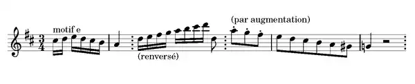 Ce motif est à l’origine de presque tous les principaux thèmes de la symphonie. Que peut-on en dire ? Il est formé de trois notes. Renversé, il donne une série de tierces. Or le nombre trois se trouve partout dans la symphonie: il en régit les proportions, le rythme, la structure des thèmes et des motifs, et jusqu’au rapport des mouvements métronomiques entre les différentes parties.