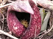 Le spadice fétide de cette plante est entouré par une spathe brunâtre en forme de capuchon de moine.