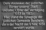 « Depuis le début du XIVe siècle, existait une communauté juive à Bensheim avec des synagogues en différents endroits. À cet emplacement se trouvait depuis 1892 la dernière synagogue. Elle a été détruite le par les nationaux-socialistes allemands à la vue de tout le monde. Les citoyennes et citoyens de la ville de Bensheim se souviennent des hommes, femmes et enfants qui ont été assassinés ou qui ont été contraints d'abandonner leur maison en raison de la tyrannie nationale-socialiste. »