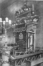 À l'est, plusieurs marches conduisent à une estrade avec la table de lecture (Bimah), le chandelier à huit branches et le siège du rabbin. Dans le fond, s'élève, montrant toute sa splendeur architecturale, le Saint des Saints (Arche Sainte) pour la conservation des rouleaux de Torah. Un rideau brodé (Parokhet) cache une solide porte fermée à clef protégeant les rouleaux. La chaire permet l'accès au sanctuaire qui peuvent tous les deux être vus de tous les sièges de la synagogue. Derrière le sanctuaire se trouve à l'étage de la galerie, la tribune pour l'orgue et le chœur. Au-dessus de cette salle, s'élève une coupole avec un lanterneau, qui trouve toute son expression architectonique par la haute construction en forme de tour s'affichant sur la façade.