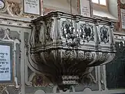 La Bimah est entourée d'une grille en fer forgé très travaillée, la table où est posé le rouleau de Torah pour sa lecture possède une base en fer forgé joliment décorée.