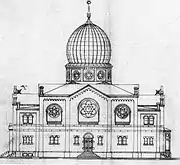 Dans les années 1880, la synagogue devient insuffisante pour la communauté qui s'agrandit. Il est alors prévu de construire une synagogue plus importante. L'architecte Wilhelm Spahr, mandaté par la communauté présente en 1895 un premier projet, où le bâtiment de base de forme romane est surmonté d'un tambour de style oriental avec un dôme en bulbe. Les plans vont être profondément révisés. Spahr réalise un ensemble assimilant le style roman tardif avec des éléments byzantins. Le dôme en bulbe est remplacé par un dôme à pans sur tambour. La salle de prière principale est de forme carrée. On pénètre par la façade ouest tout d'abord dans un vestibule, qui dessert la salle principale, et qui permet aussi d'accéder aux escaliers pour les galeries réservées aux femmes. À l'est se trouvent des pièces de service ainsi que la Bimah. L'Arche Sainte est centrée sur le mur est, dans une abside visible aussi de l'extérieur.