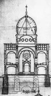 « "C'est dans une des plus belles rues de la ville que se trouve la synagogue", ainsi la dépeint la publication du rabbin provincial Dr Munk, "construite en style roman tardif avec des rappels byzantins dus au matériau en grès rouge. Le plan au sol forme un carré. La Bimah est située au milieu de la salle et son emplacement se trouve sous une coupole soutenue par quatre colonnes. Entre ces colonnes, des piliers suspenseurs se courbent en arcs-doubleaux soutenant la galerie réservée aux femmes. À l'est de la salle réservée aux hommes, se trouve une estrade avec l'Arche Sainte et la chaire. Le plancher de l'estrade se trouve 80 centimètres au-dessus de la salle[14]." »