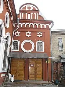 L'édifice de briques est de plan rectangulaire. La façade Est donne sur la rue Pouchkine. En son milieu, il y a une abside trièdre en saillie avec un attique au-dessus d'une frise de fausses fenêtres arquées. Les angles de cette façade sont couronnés chacun d'une petite coupole. Les fenêtres à plein cintre sont flanquées de colonnettes, et surplombées d'un oculus dont les croisillons forment une étoile de David. Sous la corniche profilée, l'édifice est orné d'une frise d'arcatures.