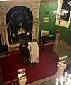 À l'intérieur les murs sont ornés de peintures de motifs floraux et de frises. La tribune réservées aux femmes, au niveau du premier étage, repose sur des colonnettes carrées en bois et entoure la salle de prière sur trois côtés. La nef qui prolonge le massif antérieur est en maçonnerie enduite.