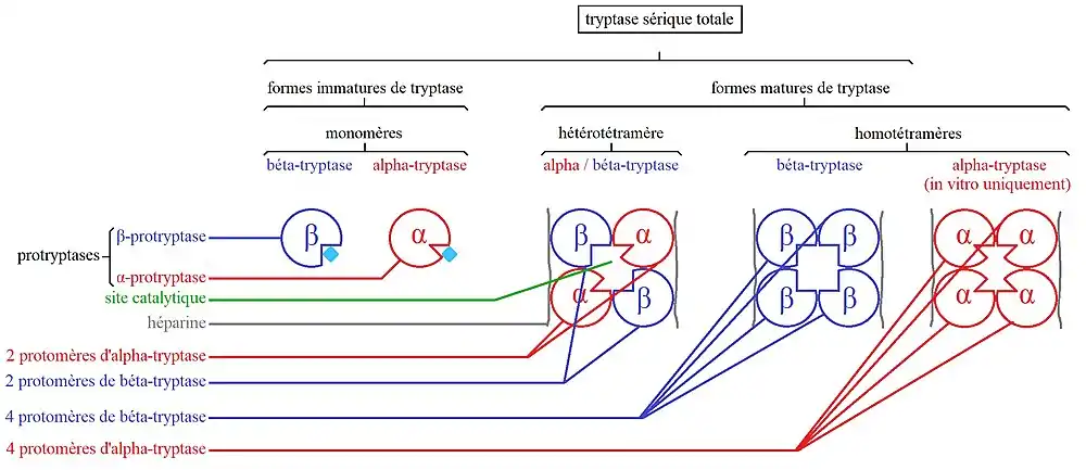 La tryptase est produite à 99 % par les mastocytes et à moins de 1 % par les basophiles[19],[20]. Chez les mastocytes, elle est secrétée sous 2 formes différentes[21] :