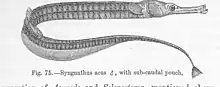 Syngnathus acus (mâle), avec une poche sous-caudale (en dessous de la queue)
