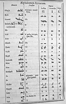 Le syriaque s'écrit de droite à gauche au moyen de l'alphabet syriaque, qui est dérivé de l'alphabet phénicien. L'alphabet syriaque se compose de 22 lettres qui peuvent être liées ou non selon leur position dans le mot. Il existe trois formes principales de typographies :